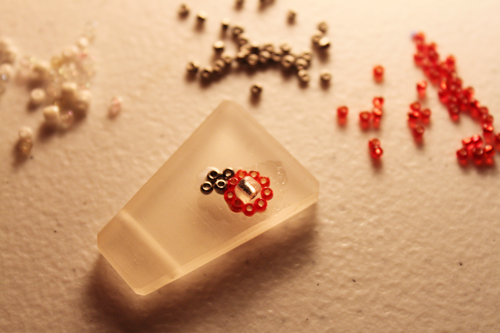 Here's the base bead with some of the seed beads to show the size of what I was working with. You can go larger or smaller on both the pendant itself and with the little beads. There's a lot of room for creativity here, the end result is very organic and forgiving so you can feel free to play with it!